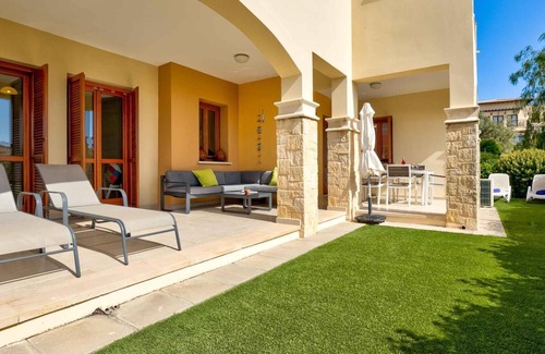 Apartment Eleos is a beautiful, modern, spacious three bedroomed ground floor apartment in the heart of Aphrodite Hills Resort, on peaceful Zephyros Village. The apartment has been tastefully decorated with modern decor and benefits from having its own private garden with terrace, perfect for sunny holiday BBQs. Inside, Apartment Eleos is spacious and comprises of a large open plan kitchen and living area with dining table and chairs. The kitchen is fully fitted, including dishwasher and a Nespresso coffee machine. The living area is furnished with a comfortable sofa and large screen TV that boasts a comprehensive TV system with International sports and movie channels with playback option. All home comforts are on offer here, so relaxing in the apartment, whether taking a break from the day's sunshine, or chilling out after dinner, feels like home from home. The property is well laid out, with two twin rooms sharing a bathroom (that has a bath with overhead shower) and a lovely large master bedroom with a newly renovated en-suite bathroom (with modern walk-in shower). The Master bedroom and one of the twin bedrooms both open up to the outside garden. All bedrooms can be reconfigured as twin or double rooms, because the beds are zip-up beds. Free, reliable wireless internet is included and the interior of the property is fully air-conditioned throughout, plus units can heat also for year-round comfort. Apartment Eleos is a real delight, with lovely modern interiors, private outside garden space and set in a great location within the resort - holidays here are spent both comfortably and happily.