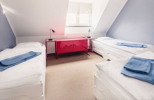 Lust Wall - the new apartment in POSTEL Wolgast (winner of the German Tourism Award 2015) Ideal for groups of 8 to 16 persons Since May 2016, we have made our former concert hall, a dormitory with family charm. The core area and communicative central point is the living room with open kitchen. With a ceiling height of up to 5 meters lovers generous spaces at your expense. The interior with massive wooden furniture radiates warmth and naturalness. 4 bedrooms with 10 beds and 3 bathrooms, the rest is a R u m. It can also be in a well-ventilated attic, the 26 m² perhaps the greatest high sleeper Germany, resting on another wonderful 6 bedsteads. Summary: 2 bedrooms with 2 Betten2 rooms with 3 bed sleeping loft 6 beds1 large living-dining room with K��chenzeile3 bathrooms with shower and WC1 hall Separate entrance Washing Service in Postel The other clearances this along the park-like historic ramparts arranged building are among the most unusual in this region. This includes indoor soccer sports hall and a particularly beautiful multipurpose room, available with parquet or carpeted floors, depending on the use for meetings, yoga, samples or performances. The POSTEL offers all its guests a very relaxing Finnish and a herbal sauna."Hang" in the hammock, table tennis and barbecue and campfire, which provides the "Postel Park" our garden directly behind the house. From there you get into the nightlife of the legendary "Kesselbar" We rent bicycles and e-bikes also Oneway with Usedomrad. In addition to our guests by CarSharing ap2drive e-cars. For e-Mobi lists: all electric vehicles can be charged at home CO2 neutral.