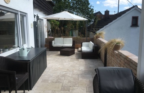 The approximately 80 square meter apartment was renovated in 2019 and furnished. It has a separate entrance door, large living room, large kitchen, 20 sqm bedroom with double bed (1.60 m) and pull-out bed (1.60 m). Furthermore, there is a small guest bathroom, a bathroom with shower and bathtub and a 40 sqm terrace overlooking the Rhine Valley.