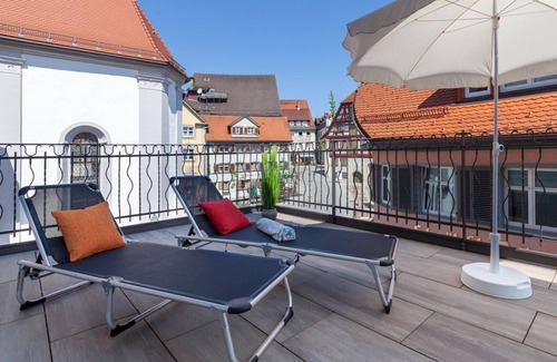 Spend wonderful holidays in our spacious 3 room apartment trading house. Enjoy your stay on the large rooftop terrace with stunning views of the historic old town. The apartment is barrier-free and equipped with parquet floors. It lies in the 2. Floor of the Hensler house and is accessible by elevator.