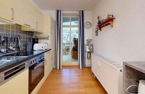 Equipment of the comfort apartment in the 2. Floor (2 Rooms / 55 m²) From the balcony and the apartment you have a fantastic view of the Baltic Sea, the beach and the Binz pier! Living room: sofa set (sleeping opportunity for 2 persons), cable TV, radio with CD, dining area, wireless Internet connection Kitchen: modern kitchen, electric stove with oven, dishwasher 1 bedroom with a double bed 1 bathroom with tub, shower, toilet and hair dryer Balcony with beautiful view of the Baltic Sea, balcony furniture and a beach chair Outside: 1 parking space at the house Other: In the season (summer) weekly bookable (Sat-Sat) New Year's Eve minimum stay 5 nights Non smoking apartment Small and large pet allowed on request Coin-operated washing machine and dryer in the house Cot and high chair on request for a fee Additional costs at the time of booking or on site: use coin-operated washing machine and dryer pet once 50, - € Cot and high chair once 24, - € Tourist tax per local statuteNote: There is construction work on the neighboring property. Should it come to disturbances and harassment, then we offer for the affected days afterwards a discount.