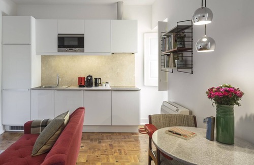 This apartment features 1 bedroom elegantly furnished, 1 bathroom, 1 living / dining / kitchen. The project, designed by the architect José Carlos Cruz, was established to rehabilitate the apartments end of the 1940s and restore them the dignity they had before. Colors, coatings, contemporary vs vintage pieces, lighting, small bookshelves and also the works of art collection flattered merge to enrich the spaces with a 'touch of heat'.This contemporary environment that collection flattered Art pontificates as a structural element of the project. The Collection consists of works of young Portuguese artists with a strong presence jobs Area Illustration and Urban Art.