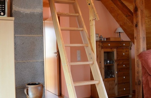 The house in which this 2-1 / 2 room apartment is located in a quiet location in Mölschow. The apartment is located on the 1st floor of a house and is accessible from an entrance hall on the ground floor via a staircase. The living room has a flat screen TV and an open kitchen. There is a car park. The apartment has a large terrace on the seats and a table are available. Integrated in the living room wooden staircase (stairs, see picture) leads inside the home in the open second bedroom with double bed, - Please note, this staircase is very steep and could for physically disabled persons and small children are a problem. You will feel at home in these apartments, so that the stay from the first day rest is pure. It is in this contract to a mediator performance for the owner Zunke. Bed linen, towels included. Pets for a fee. Not included in the price.