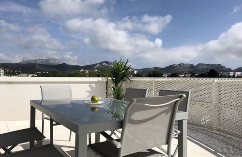 Splendid terrace of 70 m2 between Sky, Calanques and Sea. Last floor (triple exposure E, O and S).