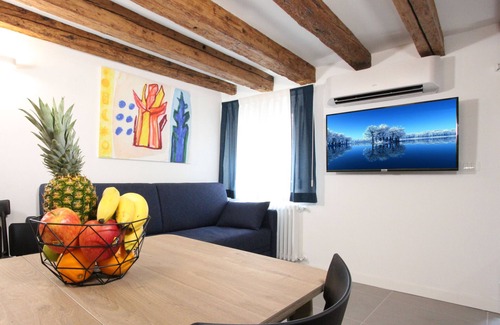 Apartment with high-level modern finishes located in the Historic Centre of Venice, 10 minutes walking from the Rialto Bridge and 15 from St. Mark's Square. The apartment is on the first floor and consists of a living area with a complete kitchen, sofa bed and dining table. The apartment is completed by two bedrooms (double and twin) and a bathroom with shower. Upon request, 2 additional sleeping places (sofa bed). Maximum capacity 6 people. Check-in time: 3:00 PM to 8:00 PM. Arrivals between 8:00 PM and 11:00 PM may require a supplement of €50 (to be paid in cash upon arrival).