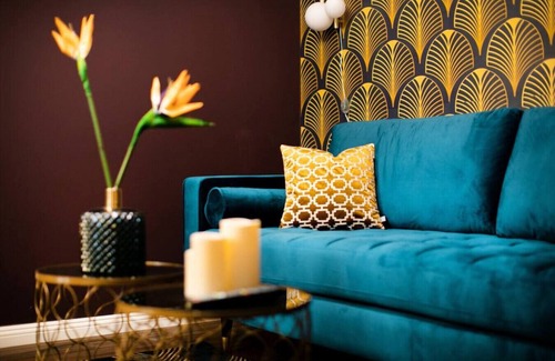 Relax in the stylish living room adorned with plush seating sofa bed, chic lighting fixtures, and tasteful artwork.