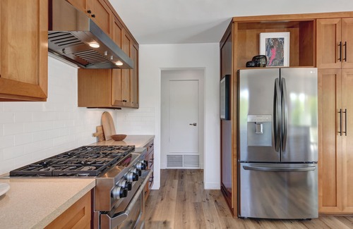 The open chef's style kitchen boasts a top-notch range with delicious Alder wood cabinetry complimented by sleek and contemporary accents. The three bedrooms, each with its own design personality, are sure to please those in your group.