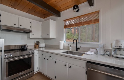 Welcome to the Architect's Retreat, a stylish chalet nestled in the popular Blue Lake Springs neighborhood of Arnold. This cabin is a haven for those seeking a perfect blend of natural beauty and modern design. As you step into the Architect's Retreat, you'll be greeted by clean lines, contemporary furnishings, and an open-concept layout that seamlessly integrates with the surrounding forest landscape. The centerpiece of this chalet is the spacious great room where large windows flood the space with natural light and the gas log stove provides a cozy ambiance. Adjacent to the great room is the dining area and modern kitchen which is fully equipped to prepare delicious meals. The cabin boasts two bedrooms, each thoughtfully designed for comfort and tranquility, as well as a loft for additional sleeping space and room for games and fun! Both bathrooms boast sleek fixtures and contemporary finishes. Step outside onto the expansive deck, where you can breathe in the fresh mountain air - whether you're relaxing with a good book, stargazing in the evening, or enjoying a barbecue with loved ones, the deck provides the perfect setting for unforgettable moments. In the summer, enjoy access to the popular Blue Lake Springs rec center (Snowflake Lodge and Fly-In Lake) with 2 lakes, pool, tennis, shuffleboard, playground, and much more (guest fees apply). You can also explore nearby attractions such as Big Trees State Park, Bear Valley Ski Resort, the Arnold Rim Trail or the charming town of Murphys.