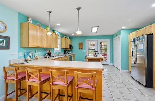 Just around the bend you will find the spacious Dining Area with seating for 6 to 8, which opens to the Gourmet Kitchen. There is also seating at the Breakfast Bar for quick meals before hitting the Beach. Ariel's Grotto has a great set-up for the Chef in your family with tons of countertop space, a Cook Top Island, every gadget imaginable, and beautiful Tile Flooring. The whimsical Coastal Decor and gorgeous Sea Green Walls make it a wonderful place to sip a glass of wine while whipping up some fresh Local Chincoteague Seafood! Is the weather too nice to dine indoors? Just a few steps off the Kitchen, gorgeous French Doors open to a huge Screened-in Porch with Dining Table. Listen to the trees rustle in the salty air and take it all in. A Gas Grill is provided on the Patio just off the Porch for grilling some burgers, or maybe that Flounder you caught Surf Fishing!