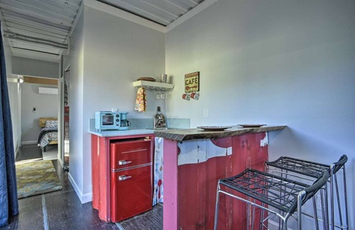The home offers a modern kitchen, completely stocked with cooking equipment and vintage dishes and tableware. There’s an expansive outdoor grill and island counter, and the garage has been converted into a spacious bar (The Branch Water Lounge) with a massive 8-foot bar and fireplace.