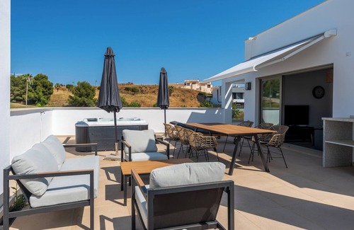 Modern penthouse with 3 bedrooms, 2 bathrooms, large terrace with private jacuzzi, sun loungers, electric awning and gas bbq grill.