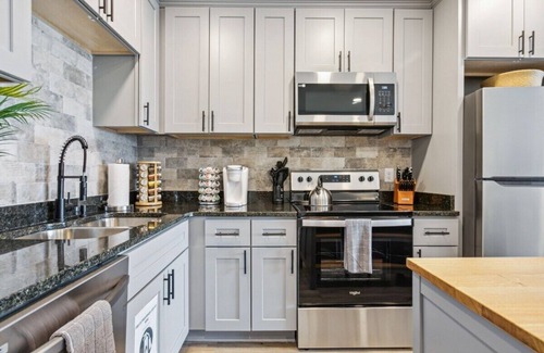 The kitchen is fully stocked with all basic cooking materials, a full fridge and freezer combo, oven, stovetop, and microwave. The bedroom features a Queen bed with ample storage in the deep closet, and an attached full bathroom.