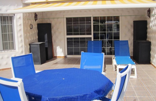 The terrace has a garden table with 4 chairs, 2 sun loungers and a large awning.