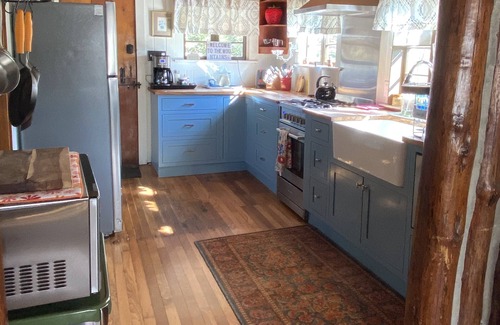 The custom kitchen includes brand new gas stove, apron front sink, fridge, pecan slab countertop, and microwave oven. In the living room, the original field stone fireplace now features a remote-controlled Jotul gas stove in addition to new central cooling and gas furnace. Stream your favorite programming on the 55" TCL Roku TV. Work from home with our high speed internet.