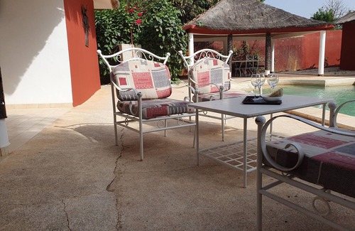 Single storey villa fully renovated on 1400 m² of wooded land including around the pool of 45 m²: a genuine hut with straw roof and private terrace, 3 bedrooms with shower-room and private toilet, kitchen and living room; another hut with 2 bedrooms and a shower-room and toilet accessible to people with reduced mobility, a pergola for meals by the pool; a hut fitted as bedroom with shower-room and toilet. Various activities are possible in the garden such as bocce ball, table-tennis, a playground where you can play tennis on a wall, a basketball hoop, football. A person on site will be in charge of the villa's maintenance. He/she can also cook; you can decide with him/her your meals during your stay (conditions on-site). You can also relax by the pool on the deck chairs in the shade or in the sun or isolate yourself in the garden in the shelter of a lemon tree or of a flamboyant. The villa is located on the small coast 80 km south of Dakar and soon 25 minutes from the new international airport. The villa is located between the sea and the lagoon, near the craft town, close to shops. Abdoulaye, who manages the villa, will offer many excursions to discover the region in an authentic way.