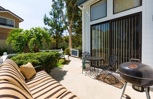 UPGRADED - Property has a downstairs Master Suite w/King bed and ensuite Bathroom, upstairs private bedroom with 2 XL twin beds and a private bath. Property has an upstairs loft / office area with additional available roll away queen sized bed. Property has a private entry on ground level - no elevators. Townhome is an end unit, nobody above or below you. Irvine is rated as one of the safest and best cities to live in America. Property rents quickly!! Located in the heart of Orange County! Close to beach, Disneyland, shopping and dining. Granite countertops & hardwood floors, with a new in-unit front load washer / dryer, and 55' & 42' Flat screen TVs & Wifi. Fully stocked kitchen w/utensils, dishes, silverware, toaster, coffee maker, etc. You will find everything you need in this townhome to meet your discriminating needs. Full access and 1 minute walk to pools & spa's. Very short walk to beach club, tennis courts and lake (pool / beach club & tennis requires 30 night stay and a small $50 one time fee). Parking convenient in lot directly behind townhome. Available maid service for fee. Most renters stay 2-3 months which keeps this property in great shape because we don't have renters moving in / out each week!! Perfect for family vacation, home away during your remodeling job, visiting your family in California! 1 small pet ok with owner approval (extra $100 cleaning fee)