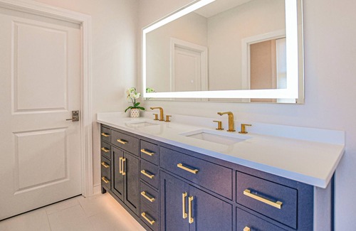 On this main level, a modern linear gas fireplace frames the entertainment area that holds two long couches and two swivel base chairs.The Master Suite features Select Comfort's newest Climate 360 Split-King on an adjustable base. This is a heated and cooled bed with adjustability to ensure the mattress firmness and sleepers temperature are perfect for each guest. The master bath features a large double shower, a freestanding tub, and private commode area.