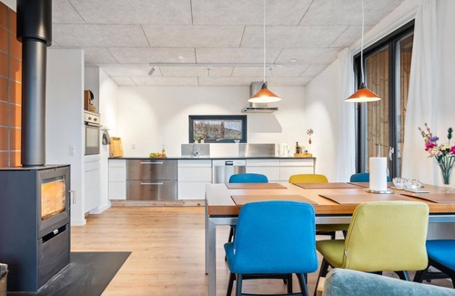 This beautiful vacation home on Vejle Fjord is tastefully furnished and lovingly decorated. As soon as you enter, you will notice the light-flooded living atmosphere and tasteful furnishings. Make yourself comfortable here and enjoy the ambience of the inviting living room, where the wood-burning stove is the warm heart of the open space on cooler days.