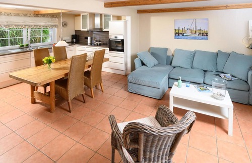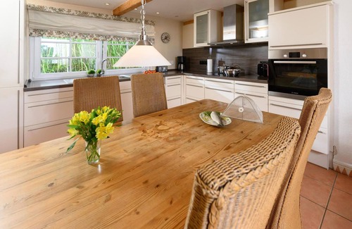 The open, bright kitchen offers high-quality equipment and flows into the stylishly furnished dining and living room, which offers direct access to the terrace and a wonderful view of the garden. The entire living area is therefore a family-friendly and communicative unit. Special features include the rustic dining table, which is reminiscent of the origins of the FISCHERKATE, the tiled stove and the underfloor heating throughout the ground floor.