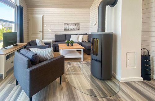 This modern wooden house is particularly close to the bathing bay, just 50 metres from the water. Here you can enjoy the lake on your doorstep on warm summer days. The house impresses with its Scandinavian style and offers plenty of space for your holiday. Thanks to the ridge-high open ceiling, you can enjoy a pleasant feeling of space and light-flooded rooms. The maritime furnishings in light colours contribute to the cosy atmosphere.