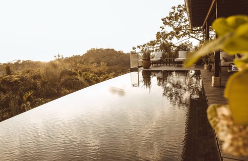 Our Cozy home - delivers 10- and 12-foot ceilings. with 3 master king bedrooms, 4 baths- 3 outdoor showers, with a 4th spacious bedroom with 2 queens and a lounge. There is air conditioning - AC, in every bedroom and fans throughout the house. Housekeeping with laundry service is provided. The home has a saltwater infinity pool, a huge eat-in gourmet kitchen with seating for 8 -10 people, an outdoor and indoor living room, outdoor dining room for 10 people. There is an outdoor terrace patio with a firepit overlooking the jungle waterfall in the rainy season.