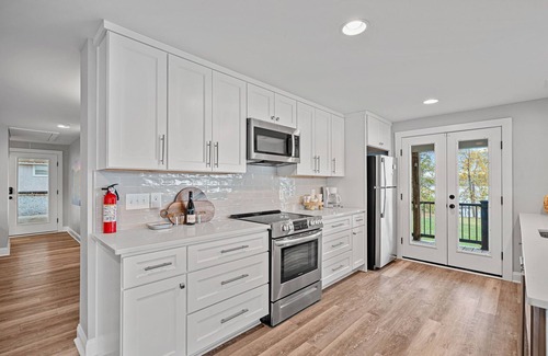 Slide open the doors to your expansive lakeside porch and step into outdoor living at its finest. Enjoy dining al fresco, watching the sunset, or simply relaxing in the fresh air with a drink in hand. After a day on the lake, gather around the fire pit to share stories and toast marshmallows. Step down to your private dock and take in the beauty of waterfront living—spend your days fishing, boating, or lounging lakeside by the firepit. For a more peaceful escape, sway in the hammock chairs on the lower-level patio and let the breeze carry your worries away. Adventure-seekers can explore the lake using the two kayaks or two stand-up paddleboards provided during your stay.