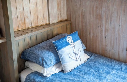 Crew Quarters features a cosy twin bunk room with full-size bunk beds, high quality linens, and an en-suite shower room. A TV and complimentary tea and coffee add to the homely feel, creating a welcoming retreat after a day of coastal adventures. The room is decorated with local artwork and unique touches, giving it a characterful and inviting ambiance.