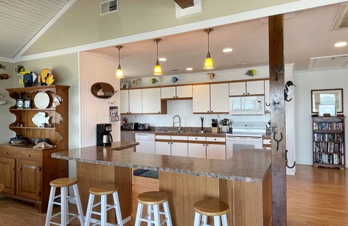 This two-bedroom vacation home on Ocracoke Island is located directly on Pamlico Sound with a private boat dock and beautiful water views. Enjoy breathtaking sunsets from the large deck. Spacious interior.