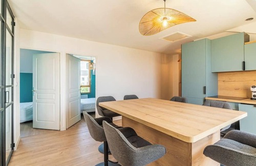 - Open-plan fitted and equipped kitchen (oven, refrigerator, microwave, dishwasher, coffee maker, toaster, kettle) with a central island.