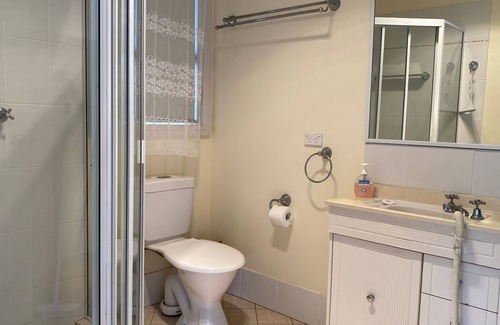 The external bathroom has a vanity, shower, toilet and a washing machine.