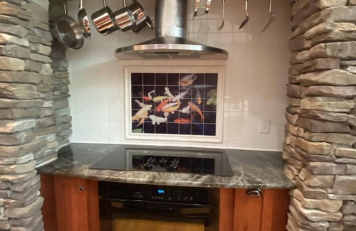 Our spacious 4,000 sf retreat features a cozy living room with gas fireplace, a modern kitchen with beautiful stonework and island featuring stainless steel appliances, counter seating and a dining table all with views of the lake. Enjoy our coffee/tea bar for those needing an extra boost in the morning! Walkout to a raised composite deck with plenty of seating and a dining table with umbrella for the perfect place to enjoy your morning coffee or an evening cocktail while staring at the tranquil waters of the cove. The kitchen features all brand new (May 2023) cookware and bakeware, silverware, dinnerware, utensils, glasses, mugs. Major appliances include a French-door refrigerator/freezer, an electric stove and dishwasher. Small appliances include a toaster, microwave oven, an air fryer and a Keurig coffee maker.