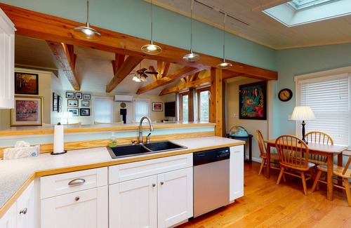 This property boasts many windows and natural light and is outfitted with vaulted ceilings with exposed beams, hardwood and tile floors, and an open floor plan. Touted by recent guests as the “perfect getaway”, Harrington Cove Cottage provides room for all! There is a full bathroom, as well as a full-sized washer and dryer for added convenience.
