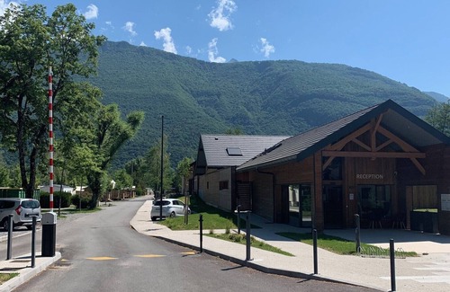 The cabin is situated on the tree lined grounds of the campsite 'Camping Sandaya La Nubliere'.