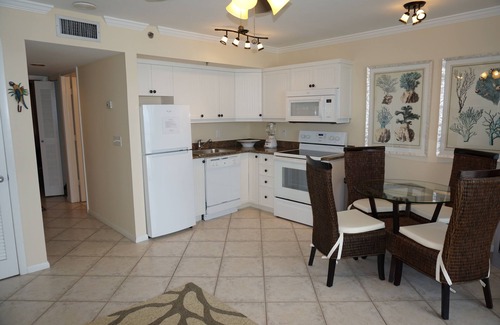 This condo is 1 bedroom, 1 bath with a fully equipped kitchen. There is a king bed in the recently updated master bedroom and a queen sleeper sofa in the living room. Flatscreen TV's with cable are in both the living room and bedroom(Smart TV in living room). Also included are books, and board games, plus free WiFi. The kitchen has been completely remodeled and has everything you need to cook a home cooked meal. Don't feel like cooking? Just take an elevator ride down to the Sunset Grille and enjoy dinner on the patio overlooking the beach. We've also included extras like beach towels, a hair dryer, and beach chairs. The bathroom has also been completely updated with a walk-in tile shower. There is a community washer and dryer room on each floor of this building, centrally located near the elevators.