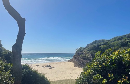 This architecturally designed 2-bedroom beach house is nestled in the rainforest, and is an easy short walk to various beaches (Little Bay 250m. Trial Bay 750m) and bush walks.