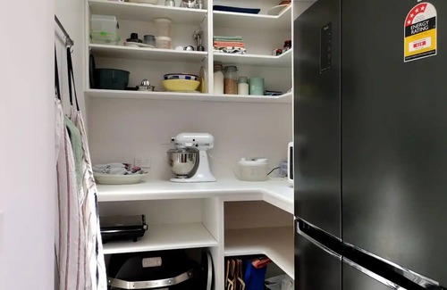 Walk-in-pantry: LG refrigerator, Kitchenaid mixer, sandwich press, stick blender and microwave.