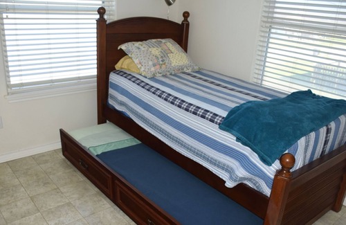 • Three bedrooms: The upstairs bedroom has a queen sized bed and two single beds (trundle). Guests using the upstairs bed can watch the sun rise over the ocean from their bed. Downstairs bedrooms: One bedroom has two single beds (trundle). The second bedroom has a full-sized bed. Sheets and towels are included.