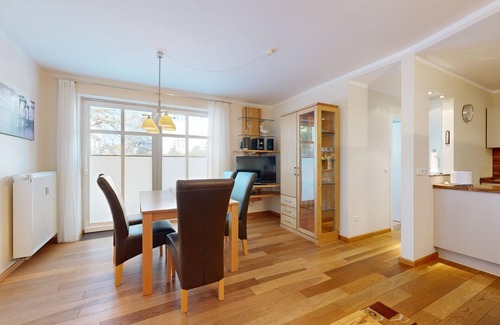 Equipment of the apartment in the 1. Floor (3 Rooms / 75 m²): • Living room: real wood parquet floors, sofa, cable TV, CD player, Wi-Fi internet connection, dining area • Kitchen: Modern kitchen, electric stove with oven, dishwasher, microwave • 2 Bedroom with a double bed (per bed 200 x 90 cm) • 1 bathroom with shower, toilet, floor heating • Balcony Outside: • 1 parking space in the underground car park (entrance height 2.05 m) Other: • In high season (summer) Weekly bookings (Sun-Sun) * New Year's Eve minimum stay 5 nights • Non smoking apartment • Elevator • Bicycle storage in the house • Pets are not allowed • Coin-operated washing machine and dryer in the house • Cot and high chair available (Registration) Included services: • For the apartment is in the summer Beach, leaving 27, left, a beach chair with the number 662 available (time 1. May to 30. September) • Car underground parking space �� Additional costs Additional costs when booking or on site: • Use of laundromat and dryer • Highchair once 24, - € • Tourist tax according to local statutes (to be paid on arrival in cash on arrival / key handover)