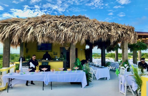 Introducing Villa Mandevilla's exclusive new rooftop event/bar/celebration area! Paired with our great wedding ceremony beach is a romantic rooftop dinner setting, bar area, bathroom and catering kitchen, perfect for your celebration. We are able to accommodate large events up to 110 persons as seen in the photos. But any celebration large or small is welcome. We have tables, chairs linens, arbor and other decorations available to rent for an additional fee. Events of up to 110 can be catered right on the roof out of our catering kitchen equipped with refrigerator, stove prep area and sink. The wet bar is large enough to accommodate up to 4 bartenders. The bathroom on the roof is also designed to handle large events. Two stairways to the roof allow easy access for large groups. We believe this is the best event venue in San Pedro Ambergris Caye. We can point you in the right direction for photographers, videographers, DJ's, cakes, flowers, officiants or anything else you might need to make you special celebration perfect.