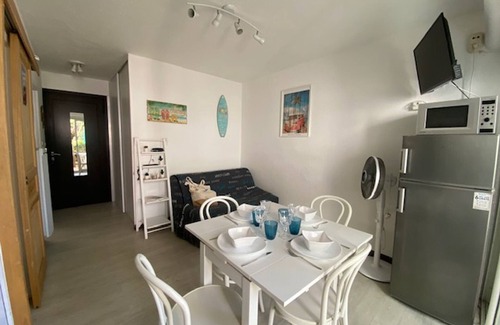 South Star Residence. 4 people. Comfortable 20m2 cabin studio located on the ground floor. Collective swimming pool in the residence (opening in July). Pleasant covered terrace. Living room (BZ), an equipped kitchen area, a sleeping area in the cabin (clic clac), a bathroom-wc. 150m from the beach.
