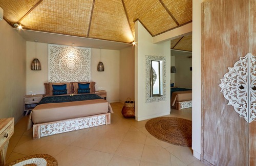 Beach front Villa Sunrise is built in the traditional Balinese pavilion style and spreads across 1200 square meters. It accommodates up to 10 guests and consists of 4 luxurious bedrooms: 1 Master bedroom with king-size bed, 2 rooms with queen-size bed, and 1 very spacious bedroom with 2 queen-size beds. Each bedroom has an exclusively designed ensuite bathroom with shower and bath.