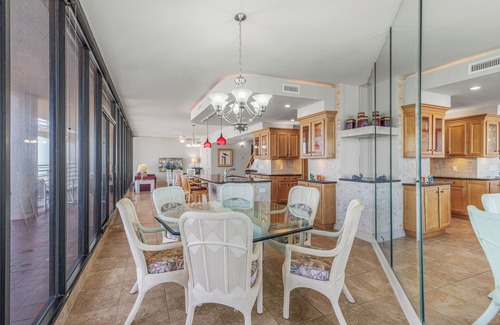 You'll be staying in a large townhome-style condo on the 11th and 12th floor of a popular resort building. Downstairs, at entry level, is an open concept living space, large kitchen, and dining area with floor-to-ceiling windows leading out to a large outdoor sundeck overlooking the resort grounds and the Gulf of Mexico. Upstairs are dual master suites, each with their own en-suite bathroom. The suites share a large balcony that provides 12th floor views of the Laguna Madre Bay and beautiful South Padre Island. A third full bath on the first level provides convenience both for daytime living.