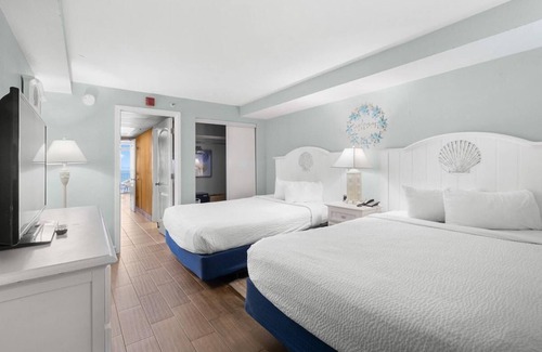 These 1BR/1BA oceanfront suites feature 2 queen beds, living room with a murphy bed -OR- sleeper sofa, dining area, kitchen, bathroom, and private balcony. These rooms start on the 3rd floor and go up to the 16th floor. The rooms are 506sq feet. All suites and balconies are non-smoking. Free Full Hot Breakfast every morning.