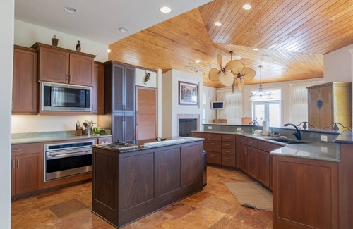 The remaining 3 bedrooms are on the lower level of the home. The second guest bedroom has a queen bed, a flat-screen TV, patio access & en-suite with walk-in shower. The third guest bedroom also has a queen bed, a flat-screen TV, & patio access. There is a third bathroom with a tub/shower combination. The bunk room has two sets of twin over full bunks & a sleeper sofa, plus a TV. There is also a full-size washer & dryer for you to use during your stay.