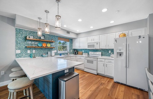 ~ Fully equipped and beautiful white kitchen with colorful blue glass backsplash giving it a fun and beachy vibe! The kitchen also includes oversized quartz countertops which will make entertaining and preparing meals a breeze BONUS is a peek-a-boo view of the Gulf of America from the kitchen!