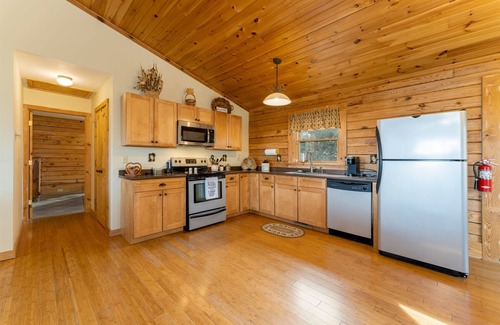 At the top of the driveway, the primary point of entry for the home is the back door. This entry opens into the spacious open kitchen, dining, and living room, with vaulted tongue-and-groove ceilings. The kitchen is complete with a Keurig coffee maker, all the dishes and cookware needed to prepare your meals, and a dining table for 6 guests. A gas grill is provided for guests who want to cook out! The living area is home to a large TV and gas fireplace.