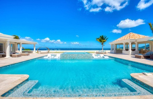 Outside, indulge in the ultimate relaxation with a heated pool and large spa offering panoramic views of the beach and the nearby island of Anguilla. The large, covered terrace and travertine pool deck, beckon you to bask in the Caribbean Sun or relax in the shade. Multiple comfortable daybeds, chaise lounges, sofas, chat seating areas, and the two outdoor dining areas offer ample space for relaxation and entertainment amidst the beach views with a backdrop of swaying palm trees and gentle sea breezes.