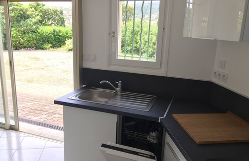 The apartment has an independent entrance; it consists of a large living room with open kitchen fully equipped (fridge, oven, microwave, induction hob, dishwasher, coffee maker, toaster, electric kettle ...), a sofa bed. the apartment opens with a large bay window on a large terrace (lounge garden, plancha ....).