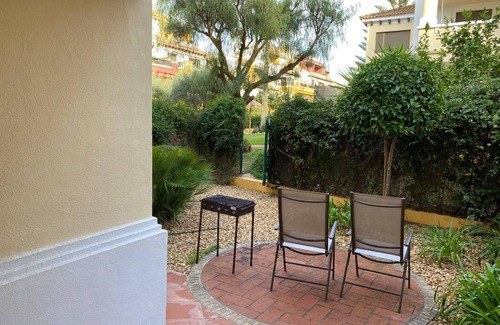 Beautiful apartment, ground floor with private garden (48 m2), in Urbanización Costa Esuri, directly beside a golf club. Own parking slot, common green area and swimming pool (for adults and for children), security in the whole residential area. Very quiet atmosphare.