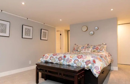 The lower level suite comes with a huge master bedroom, plenty of closet and storage space, master bath, sitting room, and small kitchenette (as I sometimes Airbnb this space when I am home.) Also decorated with pieces from my travels in Asia and Africa, you will feel truly at home in this warm cozy space.